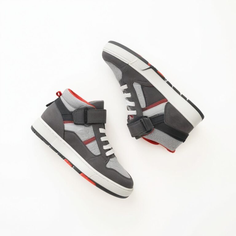 Grey and Red sneakers, featuring a sleek grey upper that’s both breathable and durable